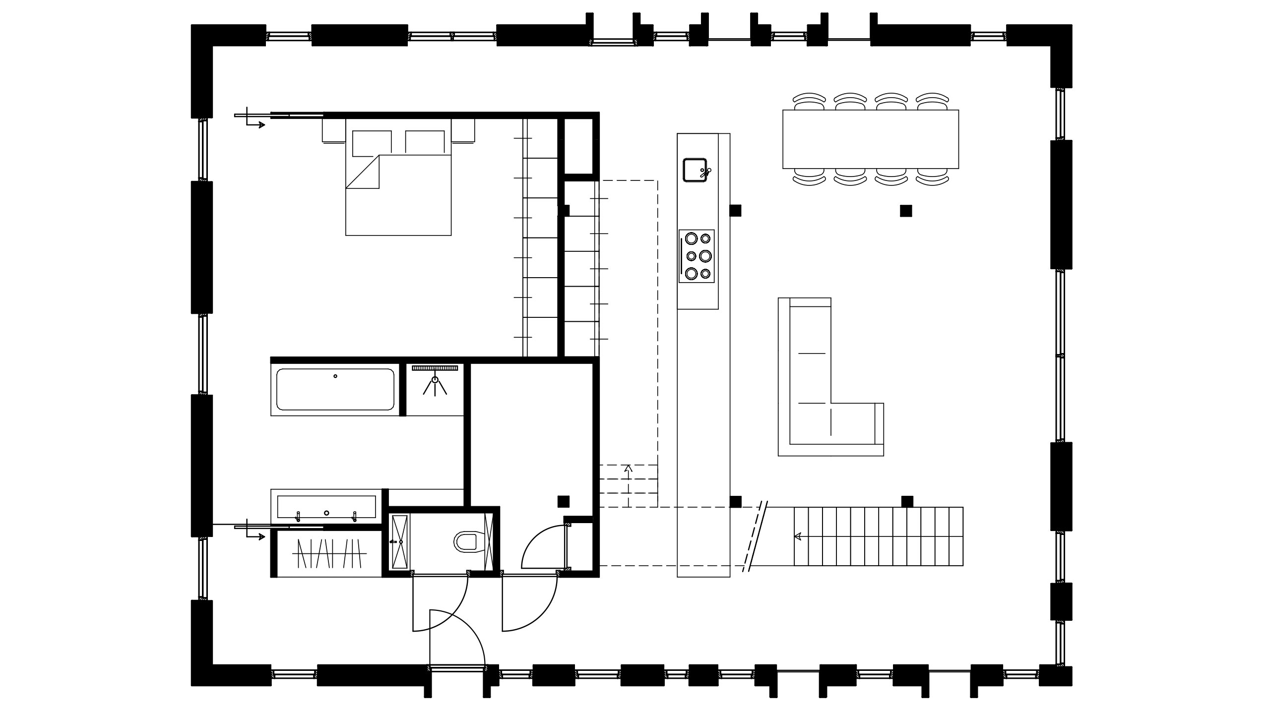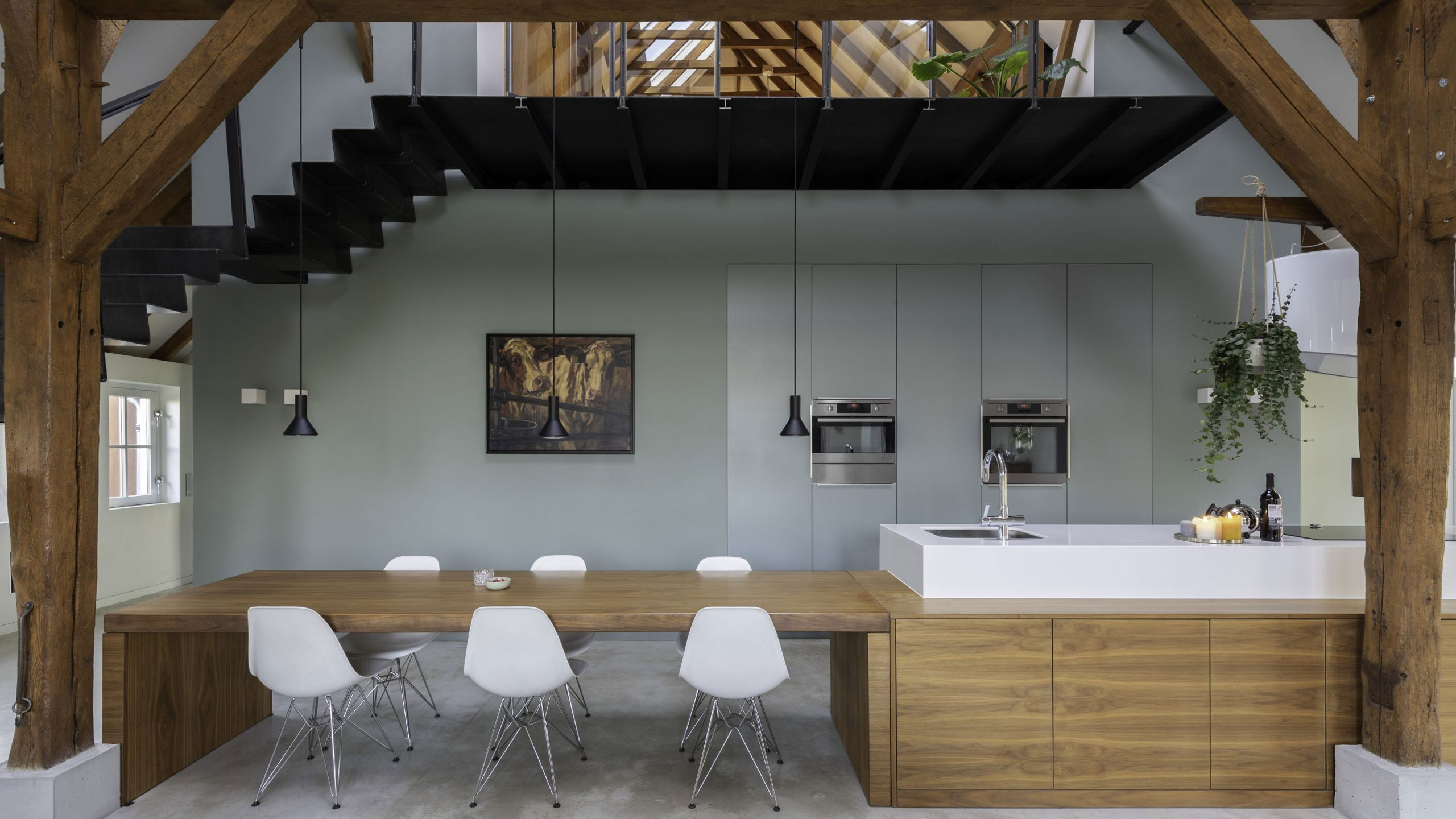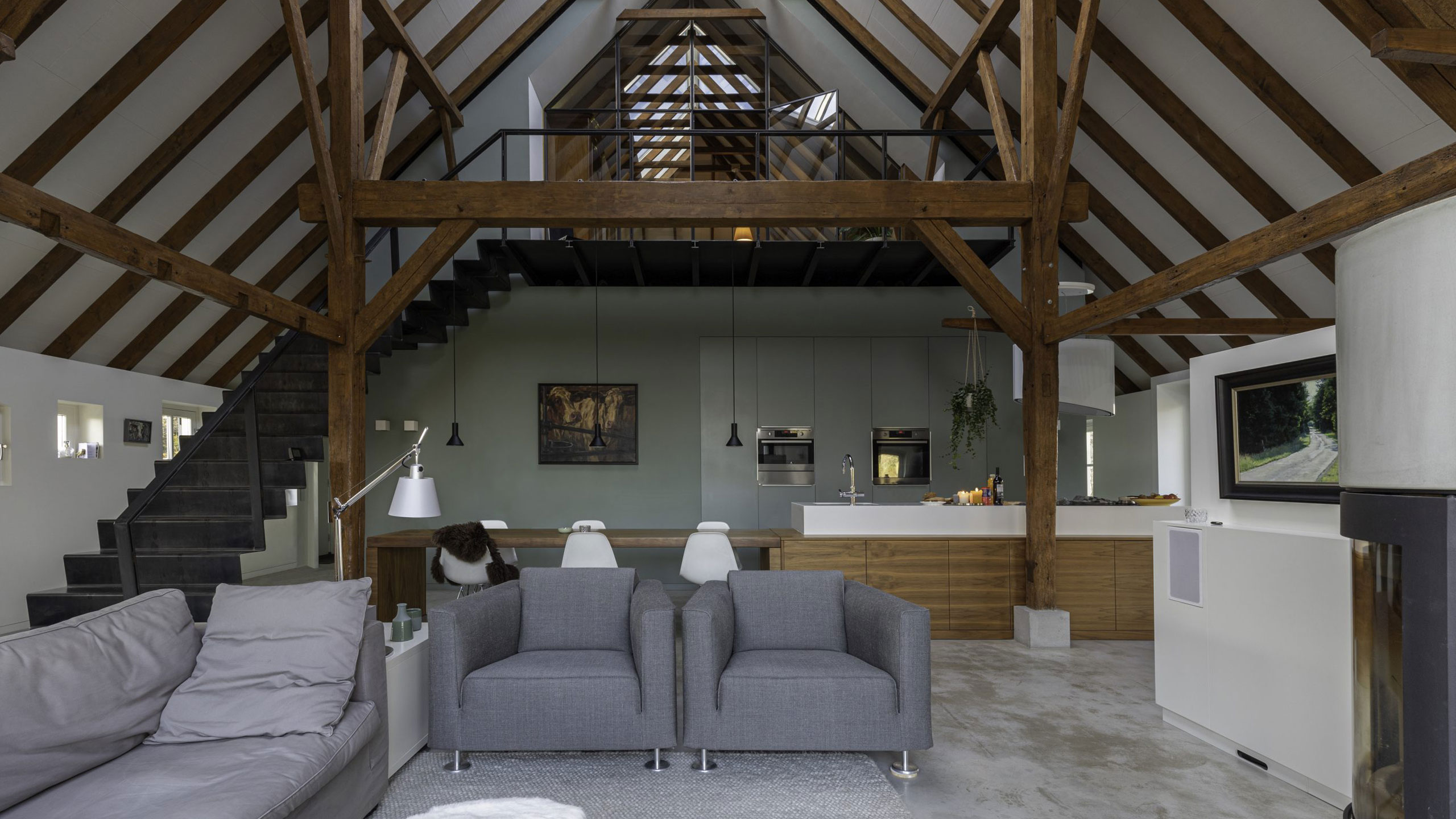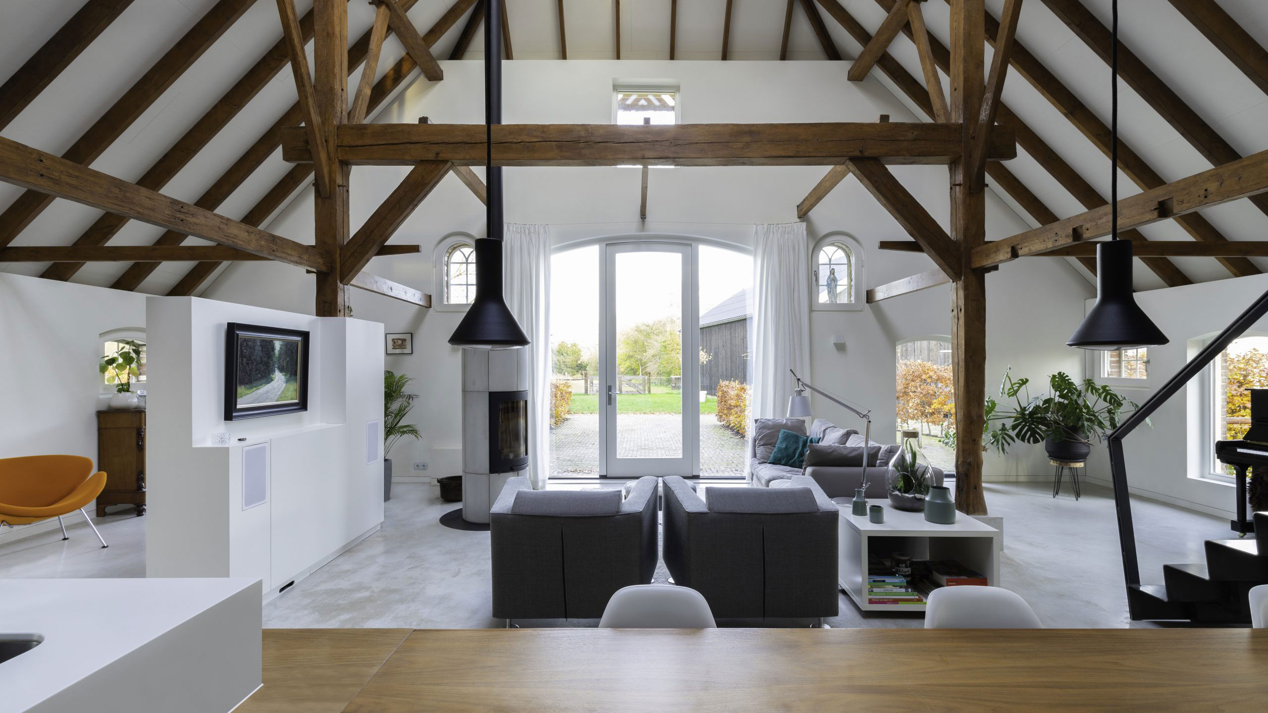 De binnenzijde van de woonboerderij is in zijn geheel gestript en opnieuw van de nodige isolatie voorzien. Het ontwerp voor het interieur in de woonboerderij bestaat uit het plaatsen van een huis in de open ruimte. In en aan dit huis zijn alle functies gekoppeld, namelijk, de keuken, de eettafel, de slaapkamer, de badkamer, de bijkeuken, het toilet en de slaapkamer. De verdieping in het geplaatste huis wordt gevormd door een slaapkamer en een badkamer. De verdieping kan worden bereikt via een brute stalen trap die via de zitkamer bereikbaar is.